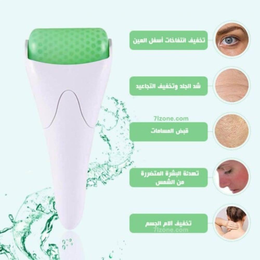 Skincool ice roller هو جهاز محمول باليد يحتوي على رأس مملوء بالماء والجيل ويتم تجميده في الفريزر.